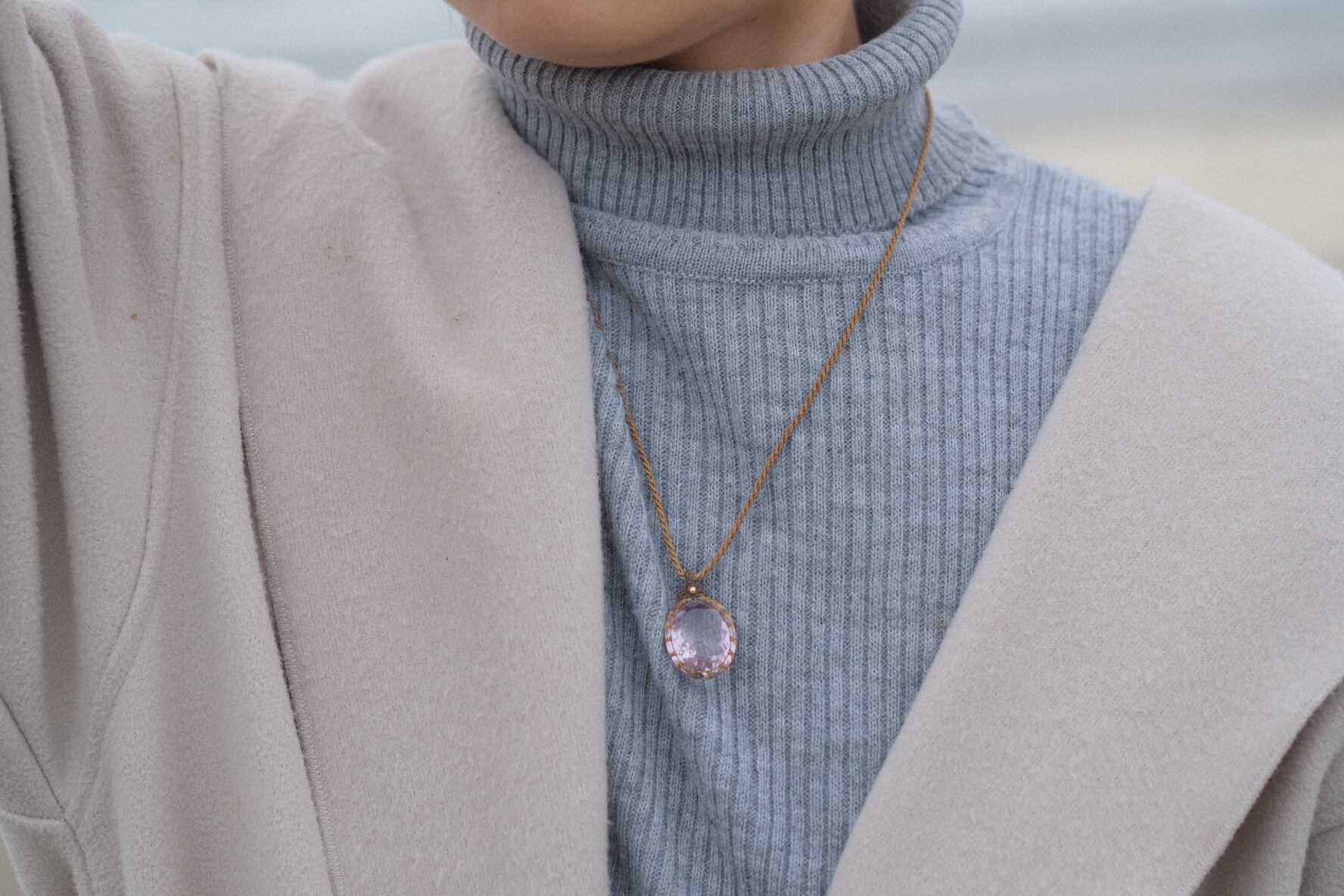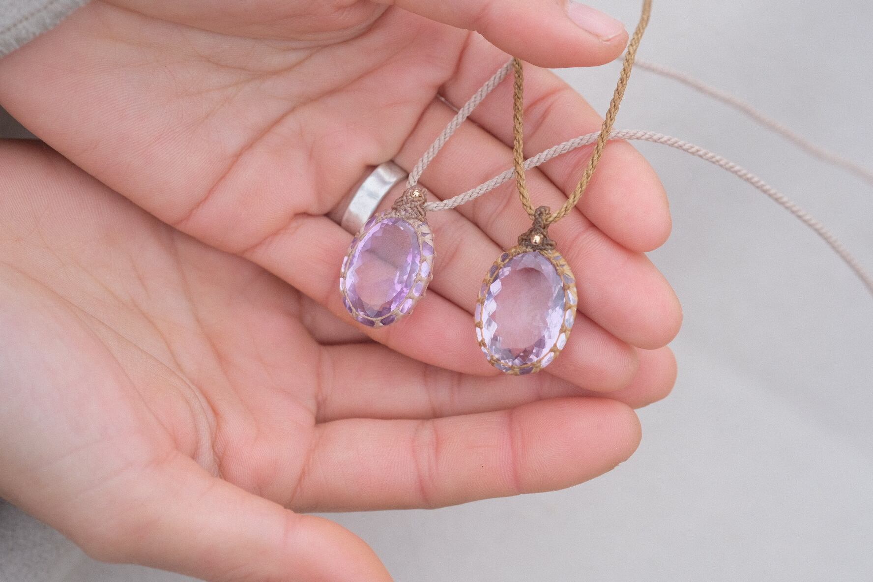 胸元にキラリと輝き、艶やかながら、優らかに包まれるような紫光を放っています。