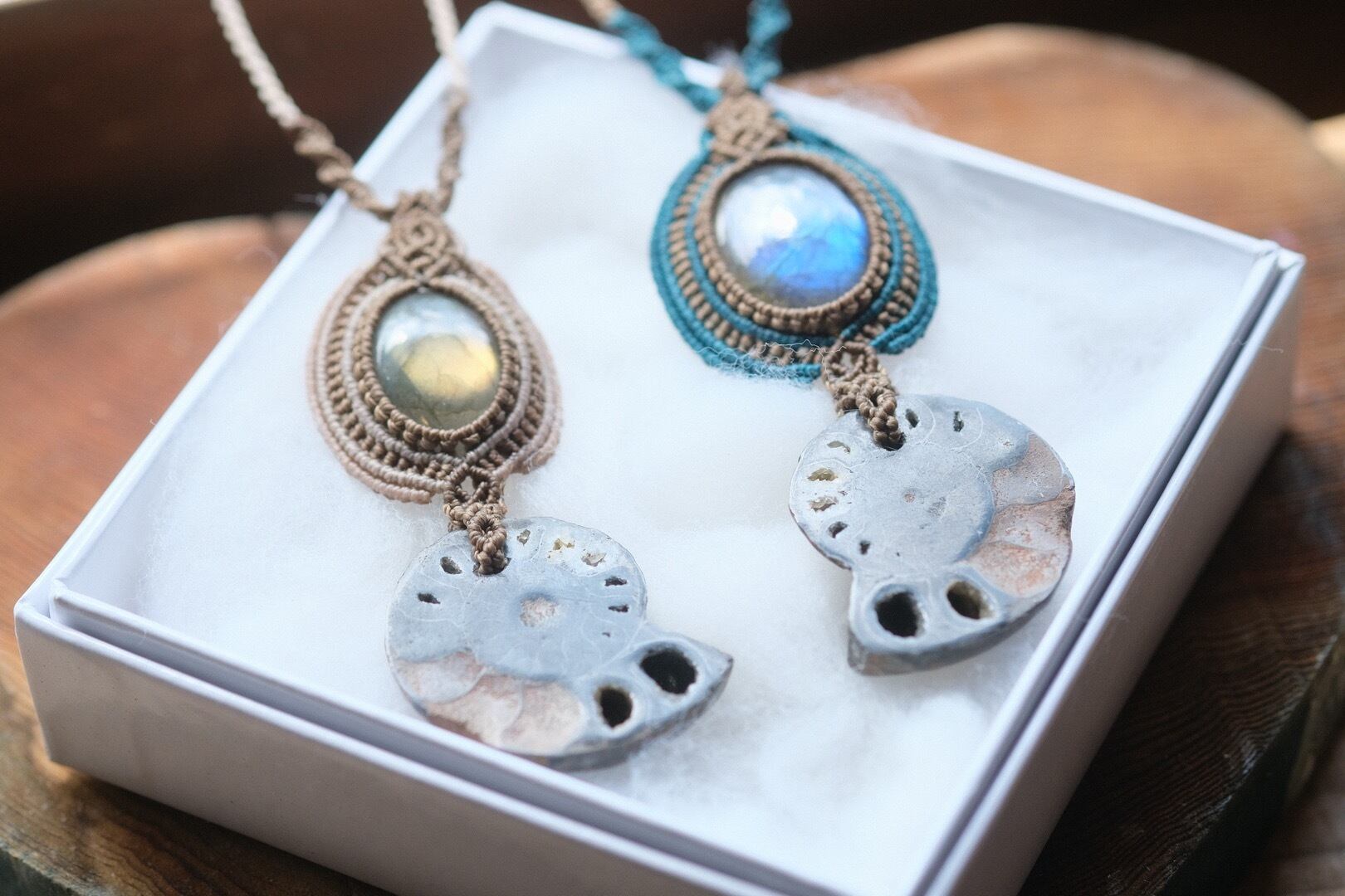 アンモナイトの黄金螺旋の美しい模様と輝く宇宙空間のようなラブラドライトを使い、繊細な手編みのマクラメ技法で仕上げました。
